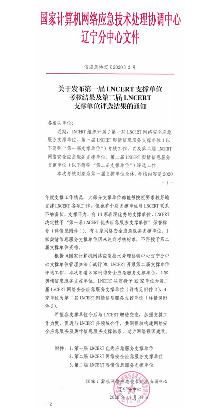 近日,国家计算机网络应急技术处理协调中心辽宁分中心(LNCERT)公布了第一届“LNCERT优秀应急服务支撑单位”(以下简称优秀支撑单位)考核结果与第二届“LNCERT支撑单位的评选结果”,爱游戏出色的完成了2020年的支撑工作,被授予“第一届LNCERT优秀应急服务支撑单位”荣誉称号。同时,凭借网络安全应急处置、安全监测与防护方面的过硬实力,成功当选“第二届LNCERT网络安全应急服务支撑单位”。
